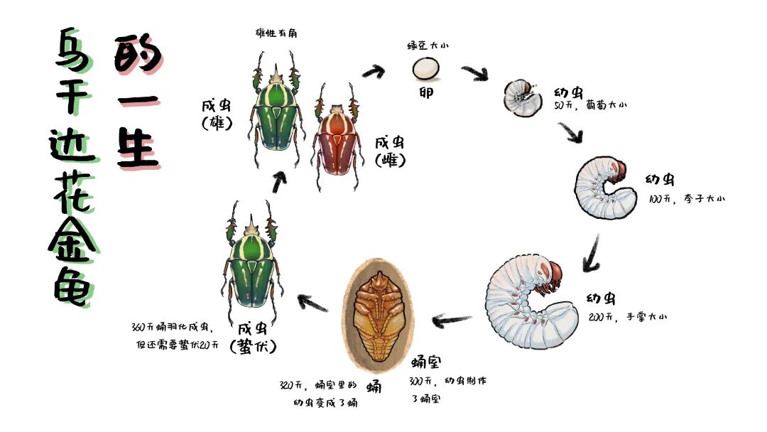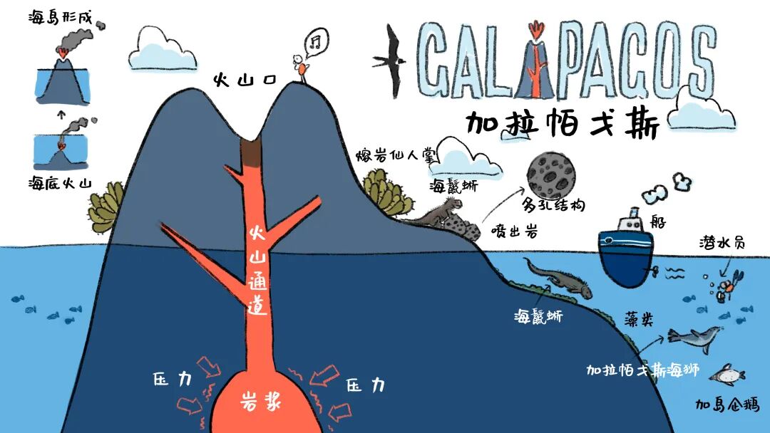 亚洲水巨蜥远渡重洋,靠游泳的方式上岛。白腹海雕通过长途飞行,靠翅膀飞到岛上。榕树的果实可以被蝙蝠带到岛上。老鼠乘坐人类的船只来到岛上。海漂植物随着洋流漂流到海岛。蕨类植物可以随风而来。物质和生命都不是凭空产生的,而是从已有的物质和生命中不断演替而形成的。海上荒岛的例子,清晰地展示了物质与生命进行运动、扩张的基本规律。关系图可以为我们展示,一个鱼缸中的微缩生态系统是如何保持正常运转的。一个完整的鱼缸生态系统中,仅有小鱼、小虾、浮游生物、水生植物就足够了吗?我们发现,缺少了硝化细菌来分解缸中的废弃物,水质很快变得浑浊。而缺少了槐叶萍与藻类争夺阳光和养分,水中又会爆炸式地长出大量藻类。通过补充这些看似微小实则重要的元素,微缩世界又重新恢复了运转。一个系统内部各要素间的关系十分复杂而微妙,一旦稳定的关系被破坏,整个系统都有可能衰败。即便某个要素看起来微不足道,它也在潜移默化地支撑着整个系统的运转。乌干达花金龟的生命周期是怎样的?为什么一颗小小的卵最终会变成颜色丰富的大型甲虫?环形流程图可以告诉我们花金龟的一生。乌干达花金龟的一生从虫卵开始,孵化后的幼虫经过近300天的生长,造起了蛹室,并在其中缓慢发育。经过40多天的蛰伏,它完成了蛰伏,最终成为了一只漂亮的成虫。雌雄配对之后,又会生出新的虫卵,重新开始新一轮的生命周期。许多事物有着许多循环往复,周而复始发展的规律,这些规律在环形流程图的展示下显得十分清晰。加拉帕格斯群岛是一座海底火山喷发形成的地质奇观。这里的岩石、岩浆、植物、动物都有哪些特点,我们可以用透视眼来描绘它的尺寸、比率和质量。加拉帕格斯群岛的内部有压力里巨大的熔岩,这些岩浆喷出后形成了多空的喷出岩,而熔岩仙人掌可以在这些岩石上生长。岛屿附近还生活着三种独特的当地动物,分别是海鬣蜥、加岛企鹅和加拉帕格斯海狮。海岛的大小与其内部的结构可以通过透视眼进行展示,海岛上的各种生物所处的位置与相对大小,也能体现在这张视觉笔记上。给孩子的视觉笔记课,专注于剖析思考方法和绘图工具,深度分析事物内部的规律。从这门课中,孩子们不仅能了解北极生物、南极企鹅、生物分类这些激动人心的自然奇观,还能够从中提炼出足以广泛应用到生活中各个方面的思维模式。